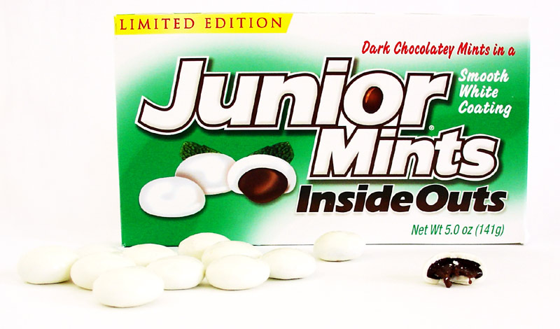 If you dig Junior Mints, stick to Junior Mints ... they can hardly be improved. They’re usually a good value (the standard single serve box is 1.84 ounces) and pretty easily understood ingredients. There are real white chocolate mint candies out there and I advise seeking them out - real white chocolate uses cocoa butter which is not only a monosaturated fat it’s just smoother. The Inside Outs are a limited edition, so if you want to give them a try, you’d better hurry.