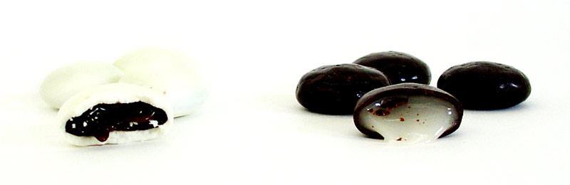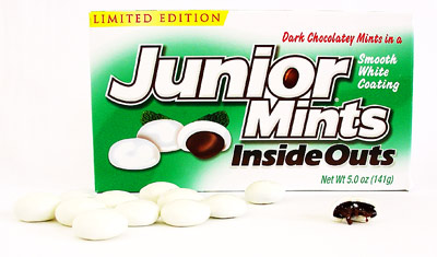 The Inside Outs are a white chocolate shell with a dark chocolate minted cream filling. They’re not at all like Junior Mints, except for the fact that they’re junior sized and minty. Where a regular Junior Mint has semi-sweet chocolate and an oozy mint filling, the Inside Outs have no real chocolate taste. Where Junior Mints are rather low in fat (for a chocolate candy), the Inside Outs don’t have that much more fat but their second ingredient (after sugar) is Partially Hydrogenated Vegetable Oil ... yes, the dreaded trans fats.