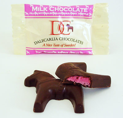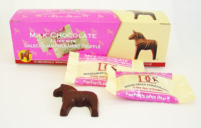 The packaging is obviously for the English-speaking market and I think they probably should have consulted some English-speaking folks to comment on their catch phrase of “A Nice Taste of Sweden!” I’m not sure if other tastes of Sweden are foul and they’re trying to differentiate themselves or if perhaps it’s a catch phrase from their popular culture that just didn’t make it in translation. I think they could also work on the name of the candy. I like to know what to call the things in conversation ... Dalamints? Horsetruffles? Milk Chocolate filled with Dalecarlian Polkamint Truffle, well, you’ve already dozed off reading that, haven’t you?