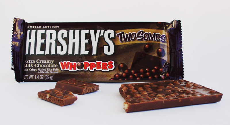 The line at the moment consists of Twosomes Heath Bar which is bits of toffee in milk chocolate (which sound suspiciously like the pre-existing Symphony bar), Twosomes Reese’s Pieces and this phenomenal Twosomes Whoppers.