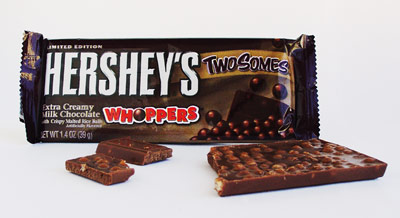 Ahhh, my pursuit of the ideal malted chocolate candy may have come to an end. Hershey has introduced a series of limited edition candy bars under the heading of TwoSomes - basically Hershey’s extra creamy milk chocolate (read: dairy milk judging by the 6 grams of cholesterol in this bar that must come from milkfat) combined with another flavor from another popular Hershey product.