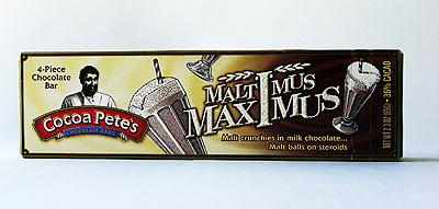 Cocoa Pete’s Maltimus MaximusName: Maltimus Maximus ![]() I love malt. I love really good malted milk balls. I will buy Ovaltine and eat it by the spoonful. I saw this candy bar while walking around on a rainy night in New York and thought, “this is the candy bar for me!” Oh, it isn’t. It’s clever. It’s cute, but lacks the real malt punch that I desire. It’s made by Cocoa Pete’s Chocolate Bars, they guy who says that he brought us Pete’s Wicked Ale. This is a guy who should know malt! Opening the package it is a bar divided into four domes that can easily be broken off for easy consumage. Two domes equals one serving. It is a nice, if a little sweet milk chocolate with malt crunchies throughout. No matter which way I ate it (sucking on it until the chocolate melted away and left me with the malty bits) or crunching it down I never got that malty taste. This is not the malt bar for me (I’m not even sure malt bars exist), but I’m willing to give his other bars a try. They’re a little pricey. Rating: 4 out of 10