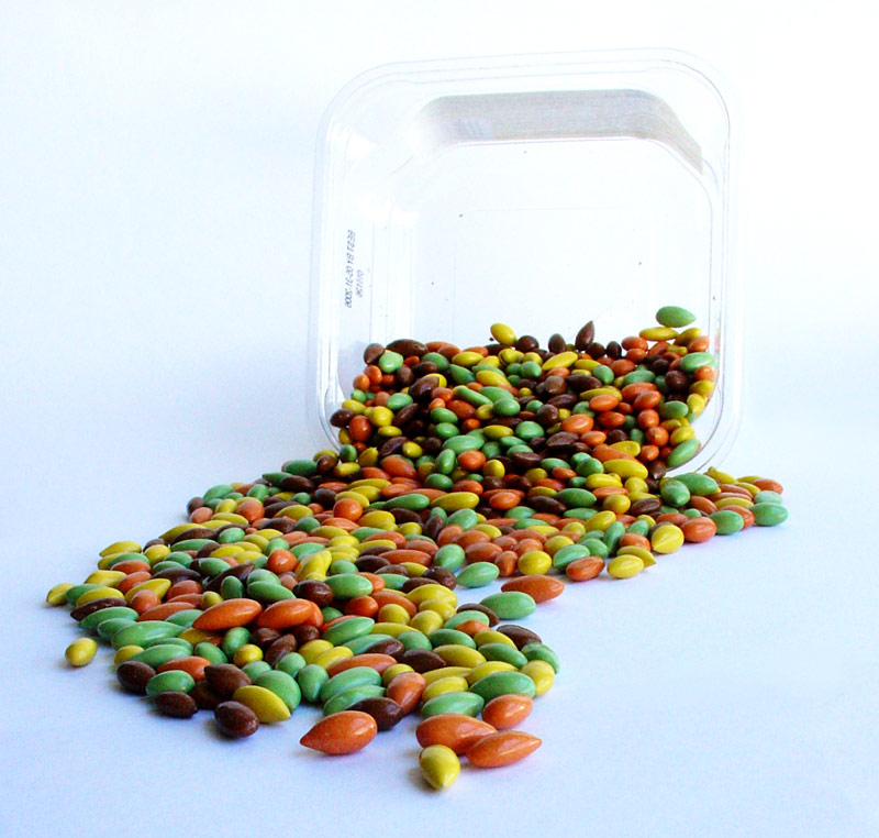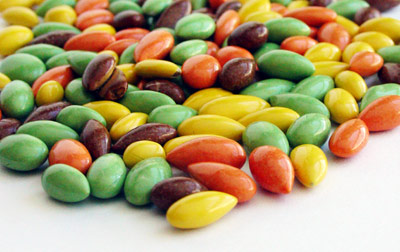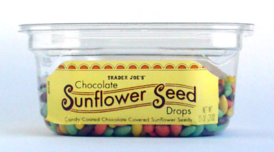 Chocolate Sunflower Seed DropsName: Chocolate Sunflower Seed Drops ![]() These were a huge surprise. I was in Trader Joe’s over the weekend, enjoying the fabulous views of candy in the frozen foods aisle and these little fellows just screamed “buy me!” and I did. They’re just so adorably cute, with their sunny colors and perfect sunflower seed shapes. First, I’m a little curious about the actual production of these guys. I mean, it seems like a lot of engineering went into these. The sunflower seeds have a consistent, thin coating of sweet milk chocolate on them and then over that is the thinnest sheath of candy shells. They’re all glossy and still have the little point at one end like a bare seed does.