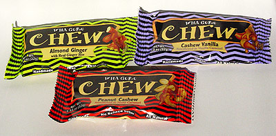 Wha Guru ChewName: Wha Guru Chew ![]() Reading over the ingredients list, I’m wondering what this has to do with the Yogi Bhajan. But I suppose even the most enlightened among us wants a sweet now and then. While there’s nothing bad about these caramel nut bars, they contain no trans fat and use brown rice syrup and evaporated cane juice instead of corn syrup, I’m struggling with the health food aspects of this. Aw hell, let’s just call it candy and be done with it. These are fab. I can’t tell you how fab these are. The caramel is flavorful and soft, the nuts are fresh and crunchy and the smell is pure buttery sweetness. The only problem I have with them is that they’re very soft, so you taking them out of the package is nearly impossible and even getting the package open without scissors ended up too much of a challenge for me. Cashew Vanilla - the right sweet notes of vanilla blended with buttery cashews. There are also sunflower seeds in here, which add an extra crunch and earthy taste to the bar to balance the sweetness of the caramel. A little touch of salt balances it all out. Almond Ginger - it doesn’t smell quite as inviting as the cashew vanilla bar (I don’t think ginger smells that good inherently, as it has a rooty/earthy smell). But biting into this bar wipes away any hesitation that this bar will be as good as the former. The ginger pops out as a spicy base for the sugary caramel and the mild almonds. A slight trace of lemon zest links all the flavors together well. Peanut Cashew - this one diverges from the recipe of the above two which are sweetened primarily with brown rice syrup and evaporated cane juice. This is sweetened with clover honey (and barley malt syrup). This honey base makes for a less viscous caramel but really amps up the flavor. The first tone you get upon biting into it is a strong orange essence. In addition to the peanuts and cashews are sesame seeds and sunflower seeds. Of the three this was my least favorite, though still worthy of trying. Rating: Tuesday, June 7, 2005