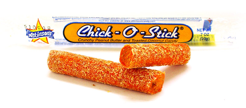 Chick-o-StickName: Chick-o-Stick ![]() These have always scared me. I think because they’re called Chick-o-Sticks and look like they could be chicken legs. Not something I’d consider to be a sweet treat. And let’s face it, the orange color is pretty freaky. The Atkinson site doesn’t really say why they’re called that except that that’s what they’ve always been called. What they really are is a peanut butter toffee crisp covered in coconut. Pretty simple. A lot like the inside of a Butterfinger bar, but a bit more solid (as you can see in the close up if you click on the photo). The taste is good, sweet with a nice hit of salt and a really good roasted peanut butter flavor. Even though the coconut looks pretty minimal, the taste is pretty significant. Unlike some of the other crisped peanut butter candies, this one contains no trans fats, in fact the only fat in it comes from the peanut butter itself. They’re much easier to carry around than some chocolate candies because it doesn’t melt, so I can see this being a good treat for hiking or shipping long distances (the Atkinson website mentions shipping them to Iraq). I know, I need to get a hold of a Clark bar and Zagnut to round out my tour of peanut crisp. Rating - 7 out of 10 Related: Butterfinger & 5th Avenue head-to-head POSTED BY Cybele AT 1:41 pm Candy • Review • Atkinson's • Coconut • Peanuts • 7-Worth It • United States • 99 Cent Only Store •