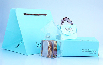 Boule Hat BoxThere are quite a few small confectioners based in LA and one that I’ve visited (and reviewed) before is Boule. They have great ice cream (I love the banana) and sorbets as well as caramels, nougats and of course chocolates. Of all the things I’ve had there, the one that blew me away was the Pate de Fruit in Calamansi flavor. Imagine my delight when one of my fellow bloggers, Joz, handed off this awesome hatbox from Boule courtesy of The Ellen DeGeneres Show. The box contained quite a few treats, including some cookies, a package of chocolate covered almonds rolled in cocoa, a box of the Pate de Fruit (which I opened and devoured the Calamansi before offering the other pieces around to my husband and neighors) and a wee little purse/box with some caramels. There were also two small boxes (6 pieces each) of Truffles.