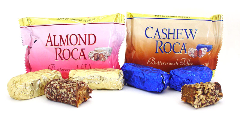 The RocasName: Almond Roca and Cashew Roca ![]() Almond Roca is cool. It’s the perfect hostess gift when you only have time to dash into the nearest drug store. Everyone likes it, it isn’t expensive, but feels like it is. It comes in a frighteningly pink tin, which is easy to slap a premade gold bow on. People who bring me Almond Roca don’t come off as cheap at all, I consider it a treat. (For the record, I don’t think anyone has ever given me Almond Roca, though I’ve been offered it at other people’s houses, no doubt someone else brought the host it as a gift.) Almond Roca is a simple little invention - a small log, like a chubby pinky finger of crispy toffee is covered in chocolate and rolled in crushed almonds. (Sorry, it kinda looks like something you’d find in the cat litter but that’s probably why they wrap it in that sassy gold foil.) Cashew Roca is the same thing, only rolled in crushed cashews and wrapped in an even more luxurious cobalt blue foil. Honestly, I couldn’t tell the difference between the two, the nuts are crushed into such small bits and their proportion to the overall mass of the toffee and chocolate is minute. The almond one has more calories, but besides the swap of nuts on the ingredients, they’re the same but maybe the cashew one is a bit creamier. The coating is a bit disappointing though, it’s always a bit greasy, sometimes comes off in clumps. It’s not real chocolate, but a pretty good grade mockolate. Still, it’s dang tasty. Ratings - 7 out of 10 POSTED BY Cybele AT 9:45 am Candy • Review • Brown & Haley • Mockolate • Nuts • Toffee • 8-Tasty • United States •