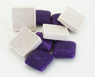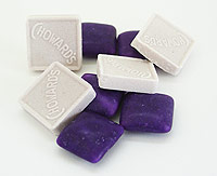 The gum, however, is pretty cool. The color, let’s face it, is something you just wanna string up on a necklace or something. The flavor is not at all like the mint, it’s got a nice cinnamon/clove twang to it and a little touch of the flowery violet. The chew is a little sticky and not at all like a chicklet, lacking that burst of sugar and cooling mint. Even after spitting out the gum after chewing for about ten minutes, it scented my breath wonderfully for a two hour meeting. Other reveiws: here and here. (more kiddles pages - here, here and here.) Ratings: Violet Mints - 5 out of 10 POSTED BY Cybele AT 9:11 am Candy • Review • C. Howard Co. • Gum • Mints • 5-Pleasant • 7-Worth It • United States •