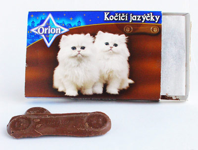 Kocici JazyckyName: Ko??i??í jazý??ky ![]() I have it on good authority that the translation of this candy is, loosely, Kitten Tongues. I suppose they do kind of look like tongues. Having never eaten a real kitten tongue (or any part of a kitten for that matter), I can’t say that they do or don’t taste like them. The little tray box slides open to reveal an array of these chocolate tongues in a piece of wax paper. Unfortunately they taste rather like wax paper. They could be stale (after all, they’ve been passed through at least two people before getting to me). But the expiration says they’re good until October ‘05. The chocolate is slightly stale and doesn’t melt quickly. It’s sweet and milky, like most European milk chocolate, but not terribly flavorful otherwise. It’s too bad too, because the photos of the kittens are as cute as can be (I’ve seen other photos on the ‘net and it seems that there are different kittens for different varieties of the chocolates). I have to say that if I were ever in a position to buy these again, I probably will, if only for the novelty of it. I can’t fathom where I’d be where they’d carry them (besides Prague) but at least now I’ve had them and know what I’d be buying (not like that time I tried to buy saffron in Spain and ended up with a tea for air sickness). See also these pages: Katzenzungen , Cokoladove and Cat’s Tongues are Grrreat. Rating - 5 out of 10. POSTED BY Cybele AT 1:02 pm Candy • Review • Nestle • Chocolate • 5-Pleasant • Czech Republic •