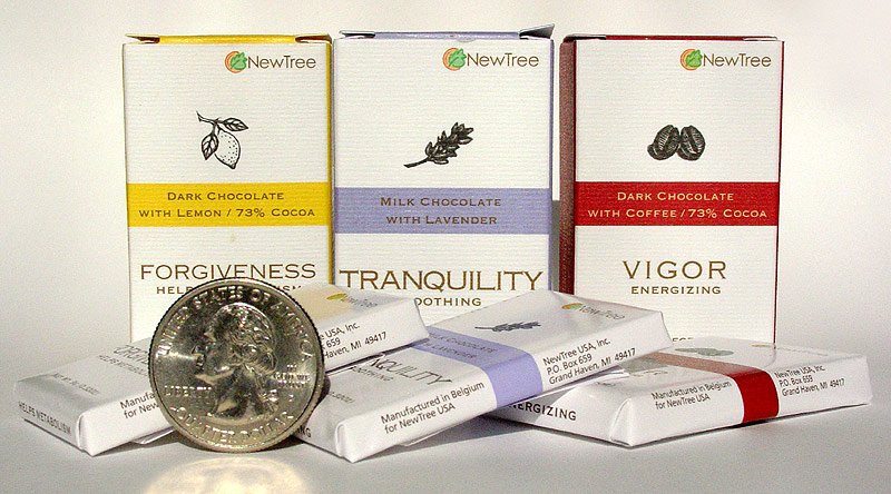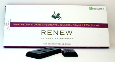 This is fine Belgian dark chocolate (73% cocoa) infused with black currant and grape flavors. Instead of just candy or a sweet treat, New Tree seems to be pushing the health benefits of chocolate, because it contains more antioxidants than a glass of red wine and 10% of your daily vaulue of vitamin D and phosphorous, 6% of the RDA for zinc and E, 15% of your iron and 20% of your magnesium. In addition, there’s a whopping 5 grams of fiber - 22% of the daily requirement! But health benefits and nutrition aside, unless you want to call these chewable vitamins and make them a chore (and expensive vitamins at that!), taste is what it’s all about… The scent of black currant and grape is quite evident upon opening the inner mylar pouch. The chocolate was a dense, glossy black and heavy for its size. While the scent of the currants is there, the taste isn’t. The taste is all chocolate. A strong bitter start with a good melt on the tongue yields a slighly grainy feeling to the chocolate, but not an unpleasant one. Then the grape essence returns as the sweetness develops. It has a very dry finish, much like wine, but sometimes (not always) a bitter lingering note. The snackability of such a rich combination of flavors isn’t really there. I can’t see myself munching on this bar, but definitely sampling it, probably in combination with some nuts or pretzels. It would probably go well with an after dinner plate of cheese and dried fruits as well (and wine or cognac). The New Tree site heralds the other versions of their chocolate, all with enigmatic power names and functions. Pleasure is just pure chocolate. Vigor is chocolate with a boost of coffee and caffeine with guarana. Forgiveness is chocolate with lemon essence and added fiber and purports to halt absorption of fat. Tranquility is milk chocolate (more sugar than the other chocolates) with lime and lavender. Rejoice is milk chocolate flavored with orange and lime and crisped rice added. They sell these in 2.8 oz bars or in little boxes with 3 x .9 oz bars of the same flavor. What I’d like to see is one box that has one of each for tasting. You can’t buy from their website and I haven’t seen them anywhere in the stores yet, but I’ll keep my eyes open. If you’re interested you can email them from the website about availability. Rating: 8 out of 10