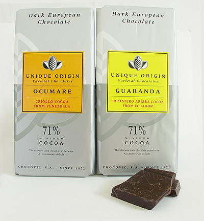 Single Origin ChocolateName: Unique Origin Ocumare & Guaranda ![]() This is not a new product to me, however, I’ve gotten a couple of notes (one email and one comment) to review this, so here goes. My husband bought a set of three of the unique origins bars one year before vacation and we took them with us to rocky beaches, windswept dunes and rolling oak-dotted hills of the central Californian coast, so any pleasant past associations with the bars must be taken into account. The bars in question were from the cocoa crop of 2004. The freshness date said they were best before 04/2007. First was the Guaranda, which is 71% cocoa solids of forastero arriba cocoa from Ecuador. The tasting notes on the back: “Perfumed aroma with fruity, acid notes and floral tones of acacia honey, with milky and exotic wood nuances. Typical personality of the cocoa bean: smooth dark chocolate taste with floral tones of honeyed character.” The ingredients are simple: cocoa mass, sugar, cocoa butter and soya lecithin. My tasting notes: the scent is woodsy, smoky and a bit like coffee. The surface is smooth and shiny (better than the photo) with a red hint to it. Upon biting into it, it snaps easily and melts quickly on the tongue. The cocoa mass is very smooth, not at all gritty. It’s very dry yet the cocoa butter gives it a slippery, cool feeling on the tongue. I don’t detect much of the honey notes, but the butteryness gives it a sort of empty feeling, like there’s a top and bottom but no middle flavors. Next was Ocumare, which is 71% cocoa solids of criollo cocoa from Venuzuela. The tasting notes on the back: “Smooth perfumed aroma with tones of exotic wood, nuts and dried fruit as well as spicy nuances. Refined and lasting taste, balanced and round at the same time. Also, aspects of cedar, tobacco and dried plums are particularly noteworthy.” The ingredients are the same as the first: cocoa mass, sugar, cocoa butter and soya lecithin. My tasting notes: the smell is woodsy with more of a fruit note to it, perhaps apple. The color is a dark and consistent brown with a good snap to the bite. It immediately starts to melt on the tongue. It has a rounder flavor just as the package suggests with more middle notes of sweet apple or apricot (I’m not catching the plum here). It’s a much fuller flavor from top to bottom with absolutely no grain to it. Towards the end there’s less of a dry finish but a nice lingering woodsy note. For high end 70%+ bars, I think these are the best I’ve tried to date. Though the single origin means that you may never get these bars again, they’re wonderfully balanced with an excellent smoothness. I do think overall that I prefer a blended chocolate to get the full-bodied taste with a multitude of notes (like a chorus instead of a soloist) but if you hadn’t told me that they were single origins, I could still state unequivocally that these are good bars. Where I find so many upscale bars lacking in the cocoa butter/smoothness factor, these bars excel at the melting and without any graininess at all. I wouldn’t say that they’re worth more than $3.50 per bar though, like you might be charged some places. So if you can get them at a Trader Joe’s or other similar economical location (maybe Cost Plus carries them), they are the best $2 you can spend on a high-cocoa content bar. Interesting facts from the package: Chocovic is based in Barcelona, Spain and has been in business since 1872. Rating - 9 out of 10. POSTED BY Cybele AT 9:13 am Candy • Review • Trader Joe's • Chocolate • Single Origin • 9-Yummy • United States •
