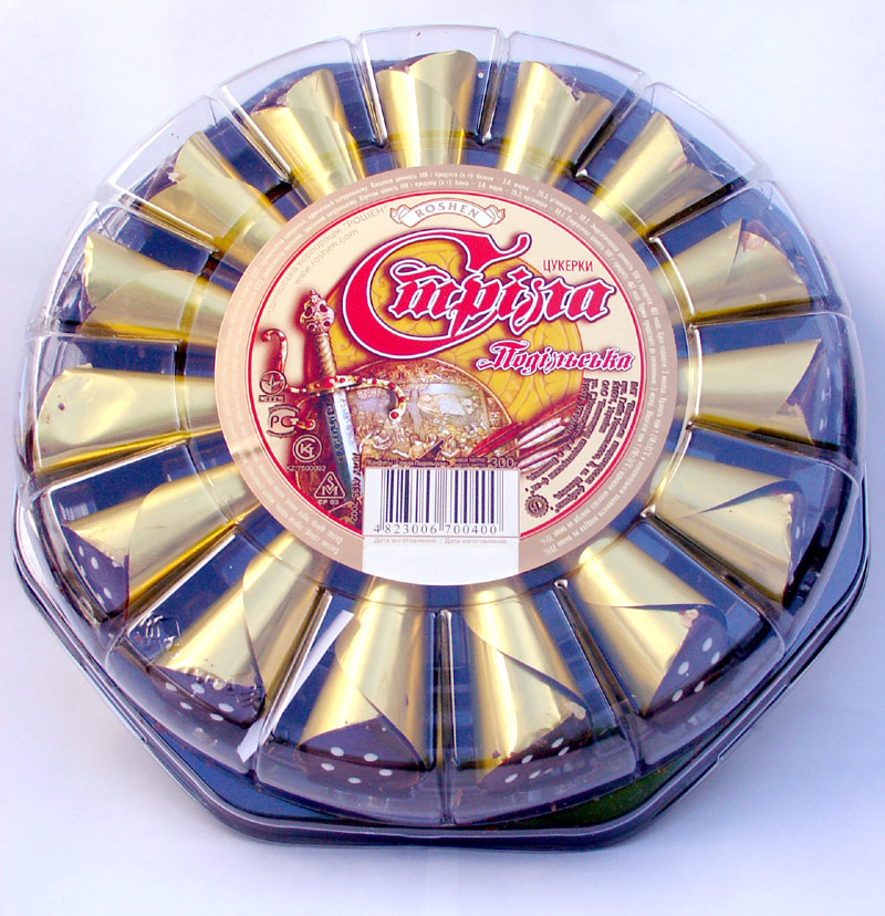 There were two packages of this candy at the market. One was called “Robin Hood’s Arrows” or something like that, but the chocolate looked a bit fuzzy, whereas this package look shiny and fresh. I figured it was the same thing. So I’ve just been calling these Arrows. I finally found them on the very nice Roshen website where they describe them as “cone-shaped sweets with chocolate coating, filling cream and fondant filling with the additive of alcohol and cognac.”