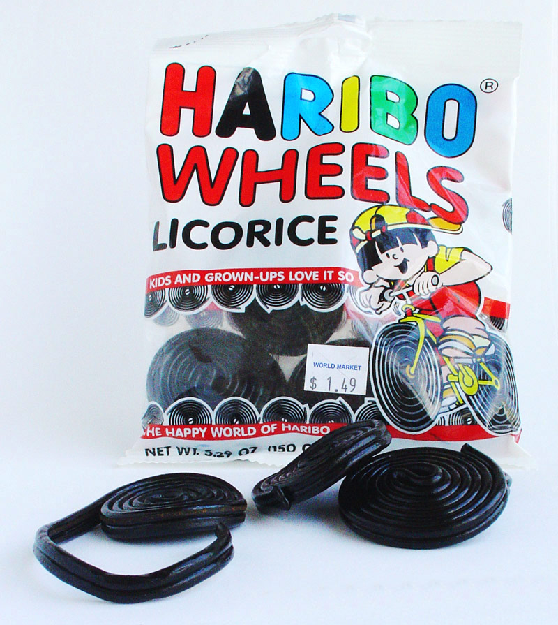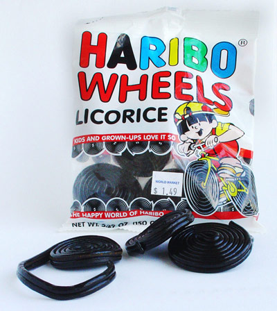 Yes, you can get licorice in whips, twists and bites, but I think that Haribo has the corner on the market when it comes to wheels. It’s really just a whip all rolled up into a disk. They look kind of like typewriter ribbon.