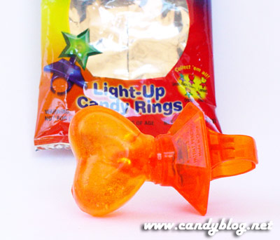 The ring comes sealed in a little plastic pouch. To activate the light, you pull out a little paper tab that allows the battery to make contact with the wiring for the LED. Then it starts flashing. And flashing. The package says it will stay lit for at least two hours. Mine is still flashing and it’s been a week since I pulled the tab and ate the lolly.
