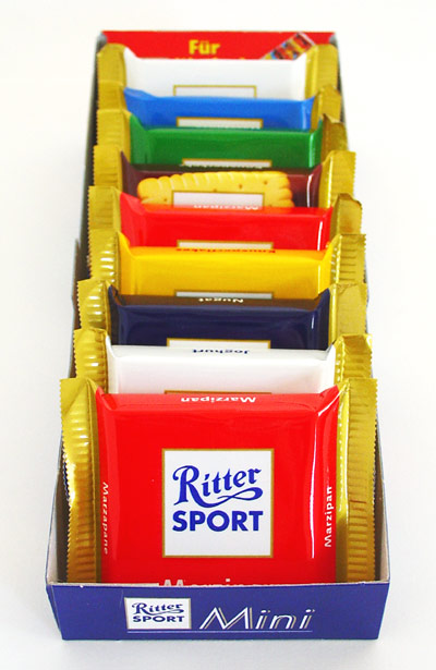 Cybele, you should track down the Alphenmilk variant of the full sized Ritter Sport. It’s much, much better than the Vollmilch version and comes in light blue packaging. I get them from my local Cost Plus World Market (along with Milka chocolate).